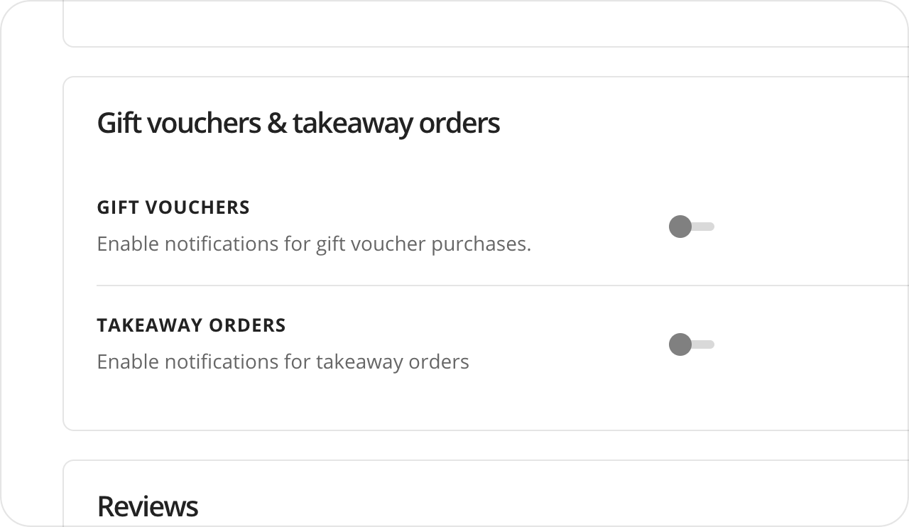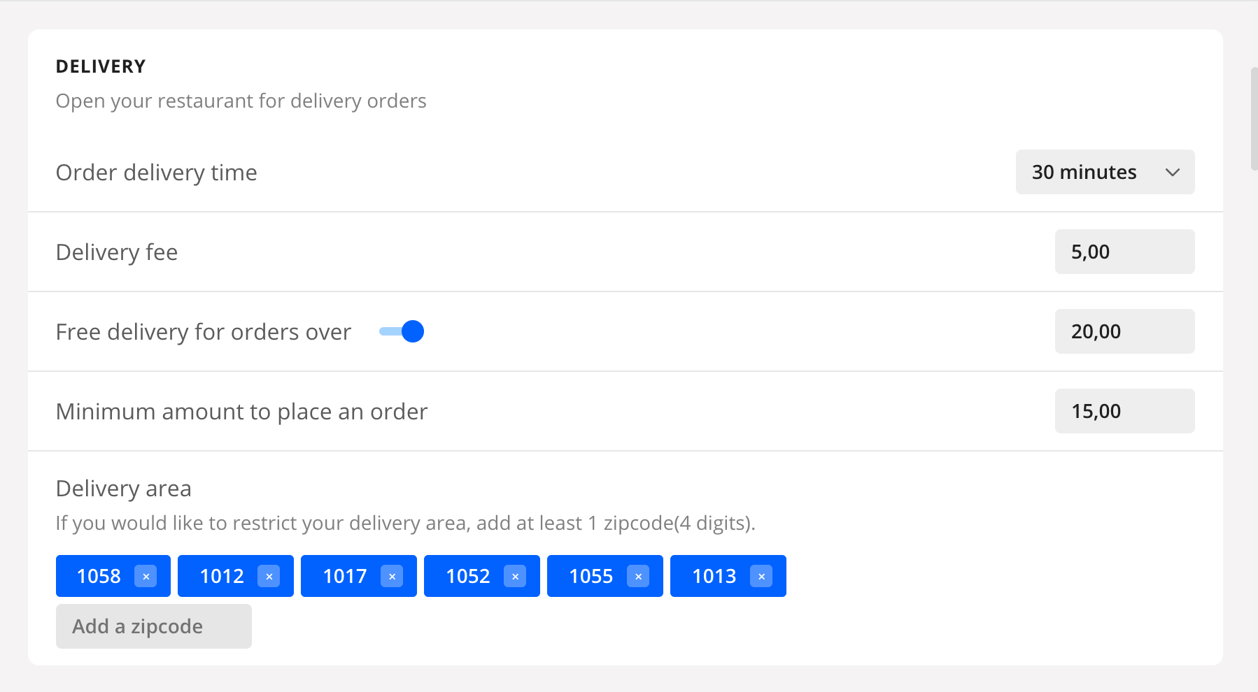 Use the toggle to start accepting takeaway orders. You can choose different settings for pick-up and delivery. Beware that your settings for pick-up and delivery will show in the takeaway shop on your website.