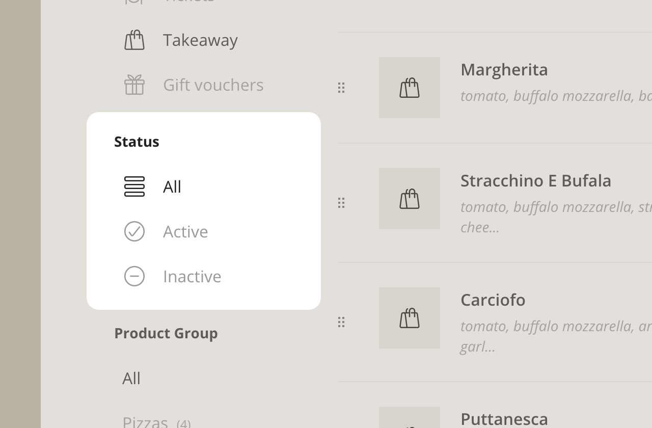 Filter on Product Group in the left menu bar in order to see, for example, your Pizza's, Specials, or Wines: