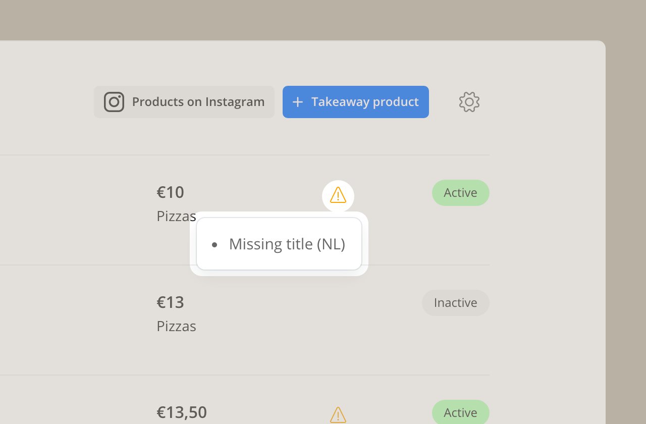 Formitable gives you a notification when one or more of your Takeaway products are incomplete. This way you'll be able to supplement your content where necessary and only show 'complete' products in all languages.