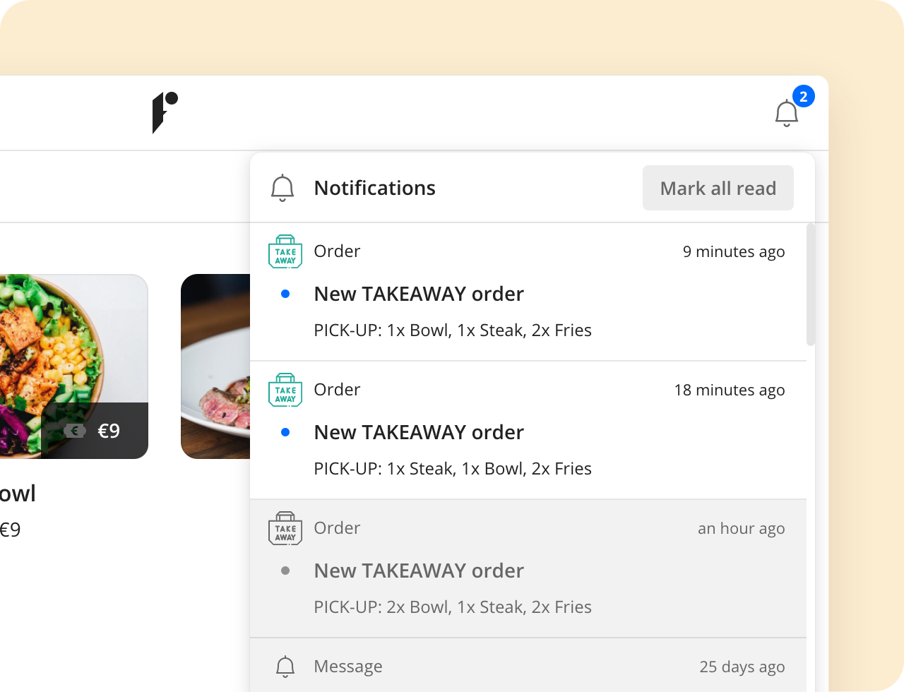 For new orders, we update the Activity page, and you instantly get a system notification (sound included) in the right upper corner.