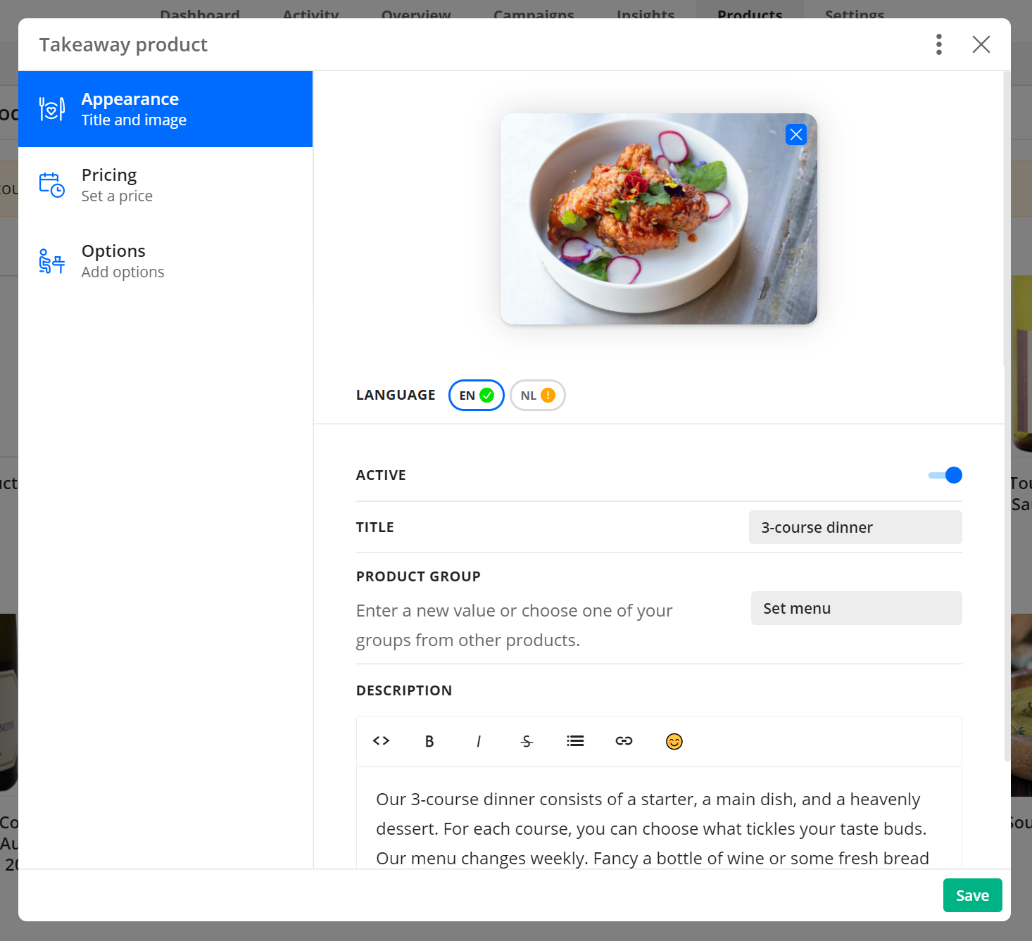 At Options, you can add all kinds of extras, supplements, and choices. Read more about the Takeaway Product Options here (incl. video).