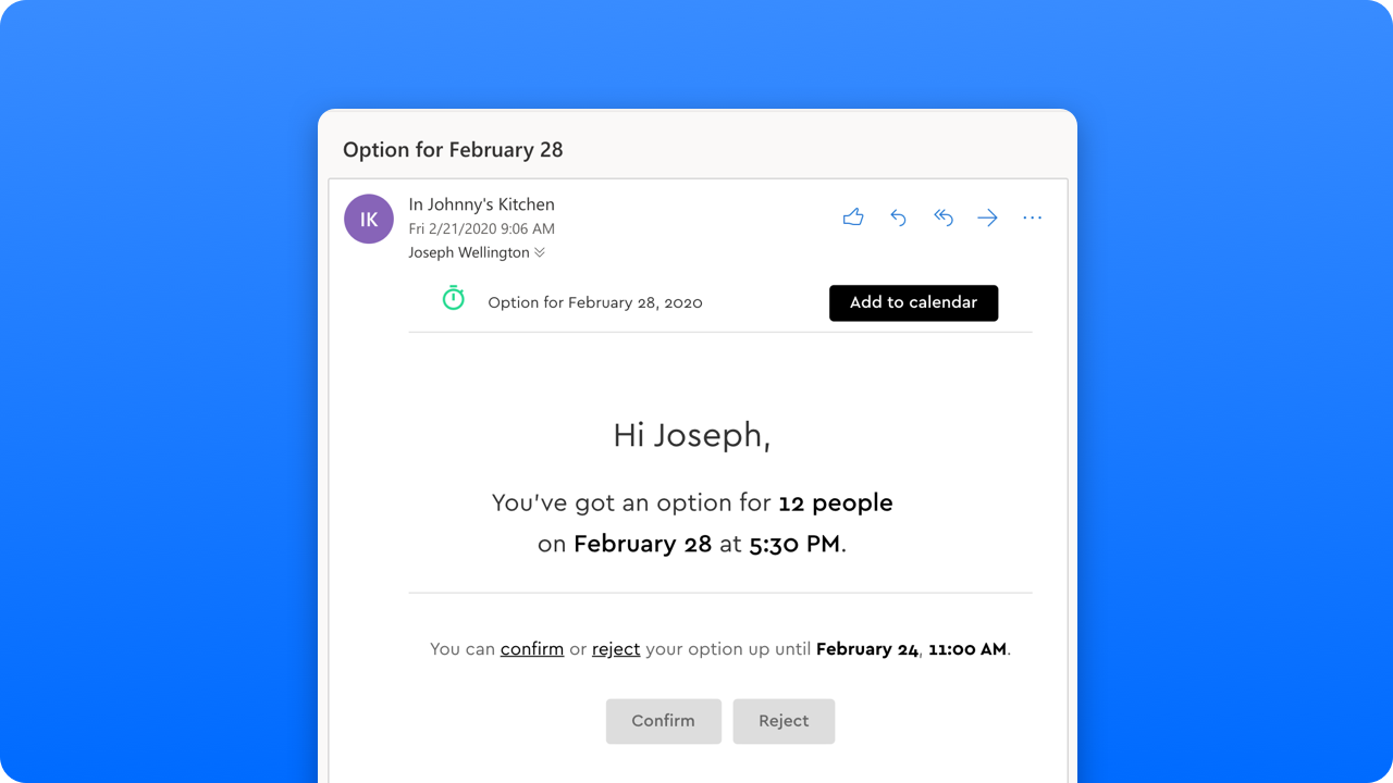 When you create an option the guest will receive an email asking them to confirm or decline the option. Once the guest accepts the option or pays via the payment link the option automatically becomes a reservation. Without confirmation, the option simply expires and the table will be bookable again for other guests.