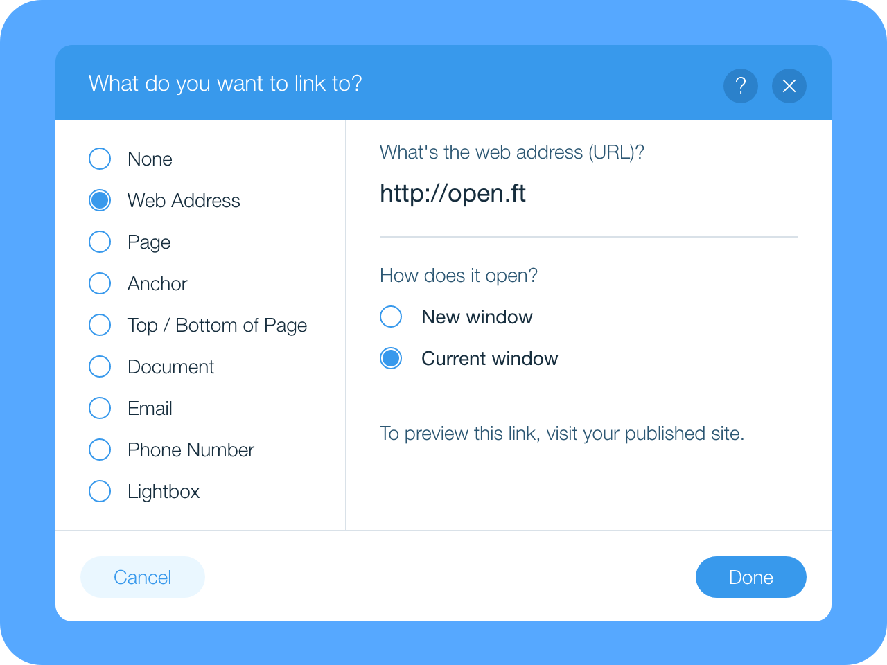 Make sure that the link opens in the current window. When you are ready, click Done and make sure to publish your changes.