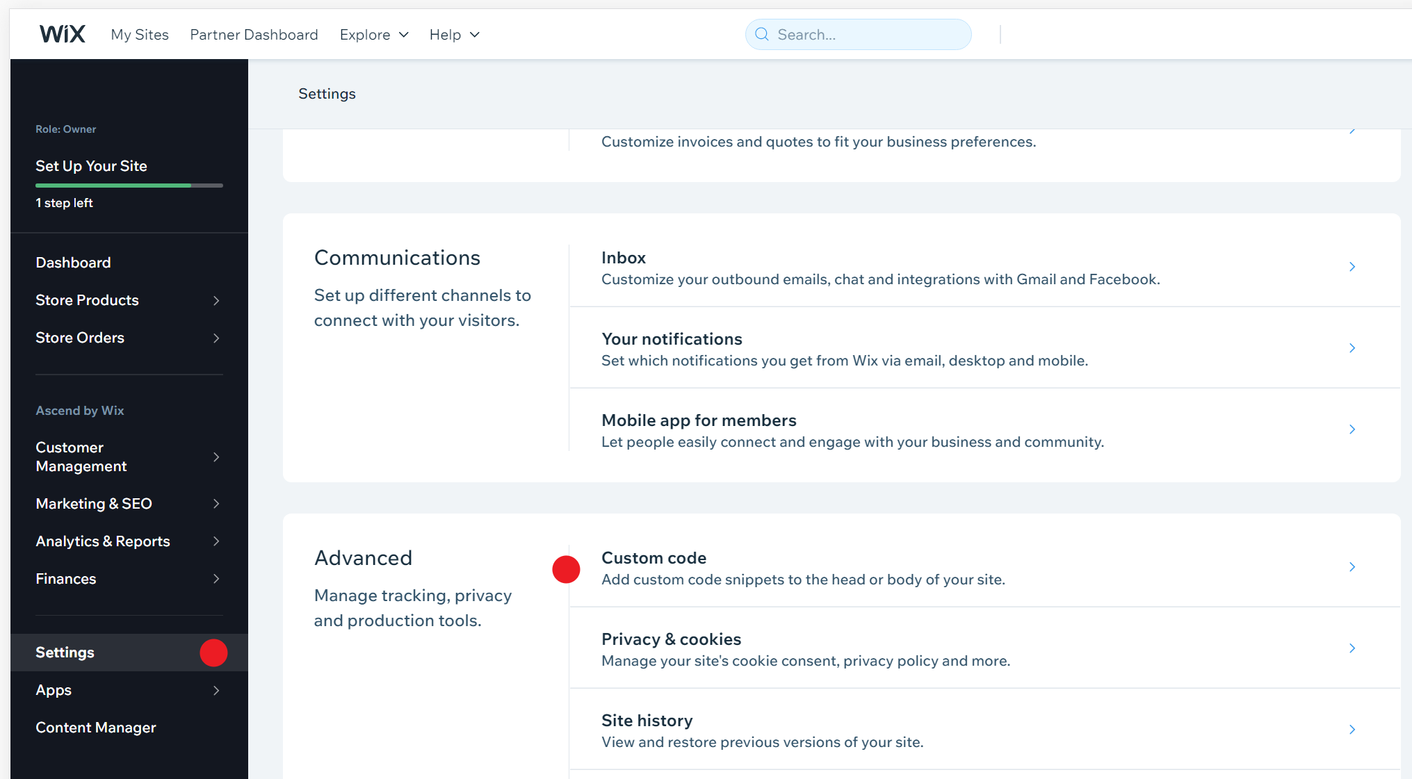 Choose Settings in the menu on the left, scroll down to Advanced, and select Custom code.