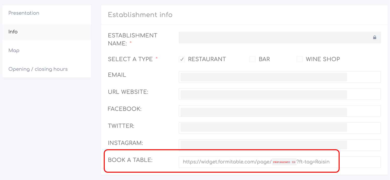In je Raisin PRO Account, ga naar 'My Establishment' > 'Info' > 'Book A Table'