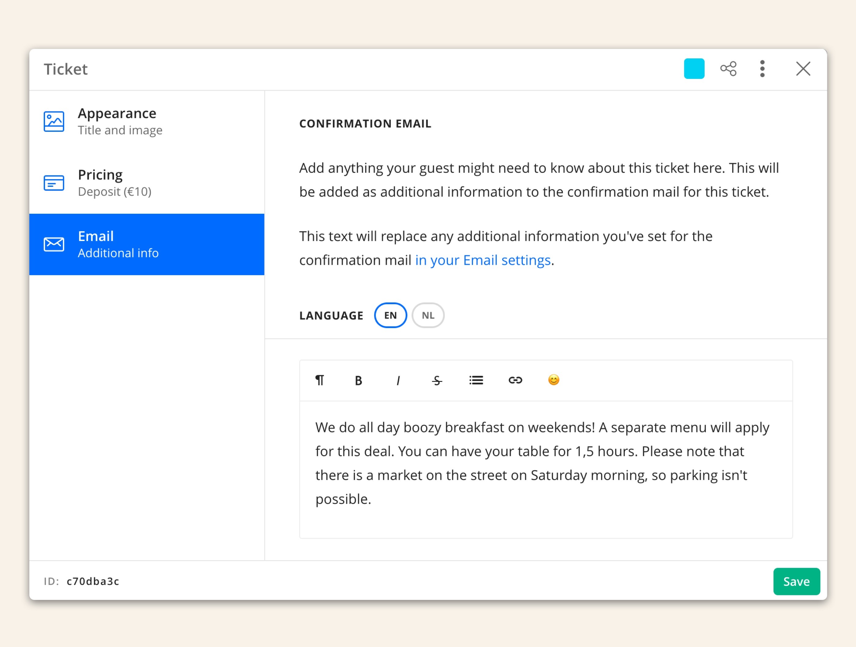 Gebruik je meerdere tickets en wil je per ticket extra informatie verschaffen aan je gasten? Bijvoorbeeld dat je met een vast menu werkt bij grote groepen? Of dat gasten ergens anders moeten parkeren als ze je zondag brunch ticket boeken, vanwege die markt voor de deur?