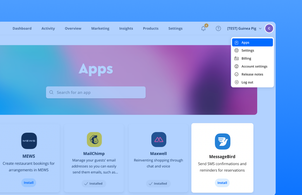 Ga naar Apps om MessageBird in Formitable te installeren.