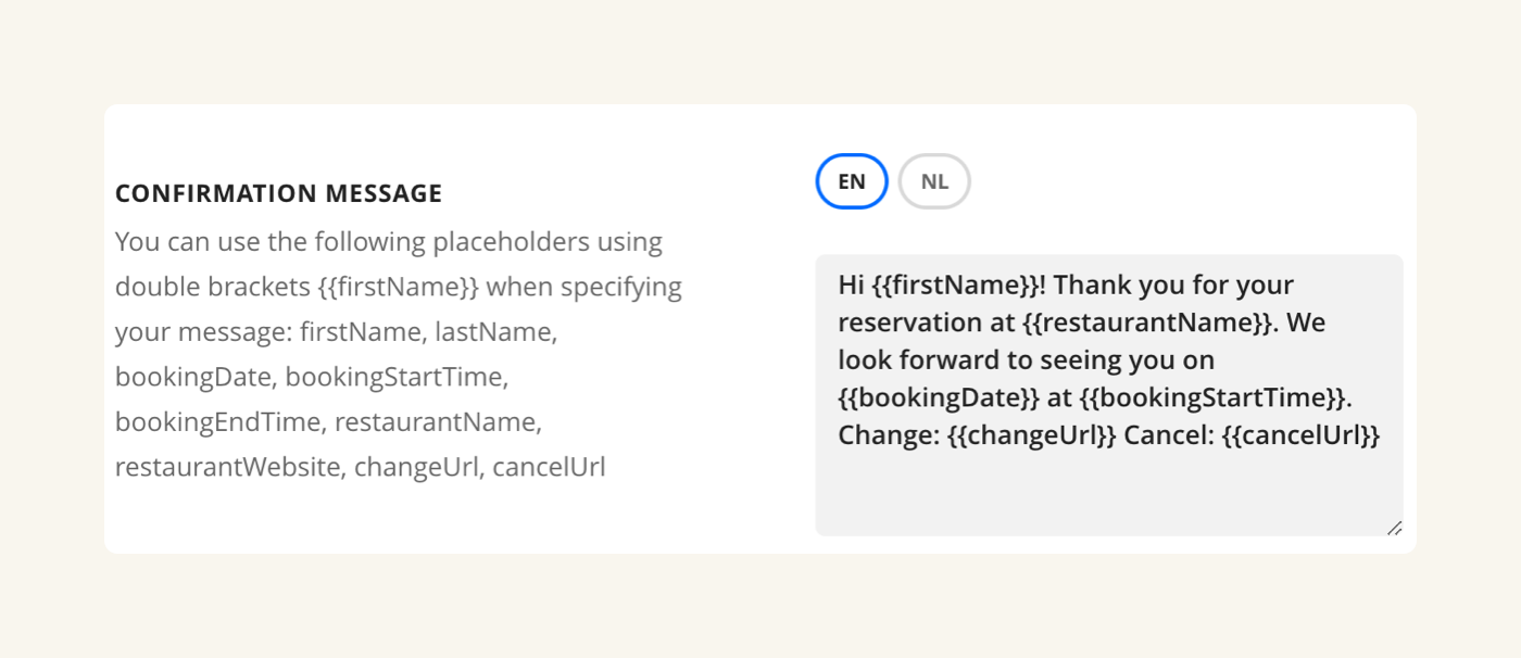 Hi #{{firstName}}, hartelijk dank voor je reservering bij #{{restaurantName}}. We kijken ernaar uit om je te ontvangen op #{{bookingDate}} om #{{bookingStartTime}}! Als je om wat voor reden dan ook je reservering wenst te wijzigen, kan dat via #{{changeUrl}} of je kunt annuleren via #{{cancelUrl}}. Tot snel! |