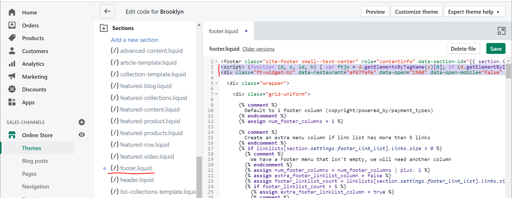Scroll naar het Sections gedeelte en selecteer 'footer.liquid'.