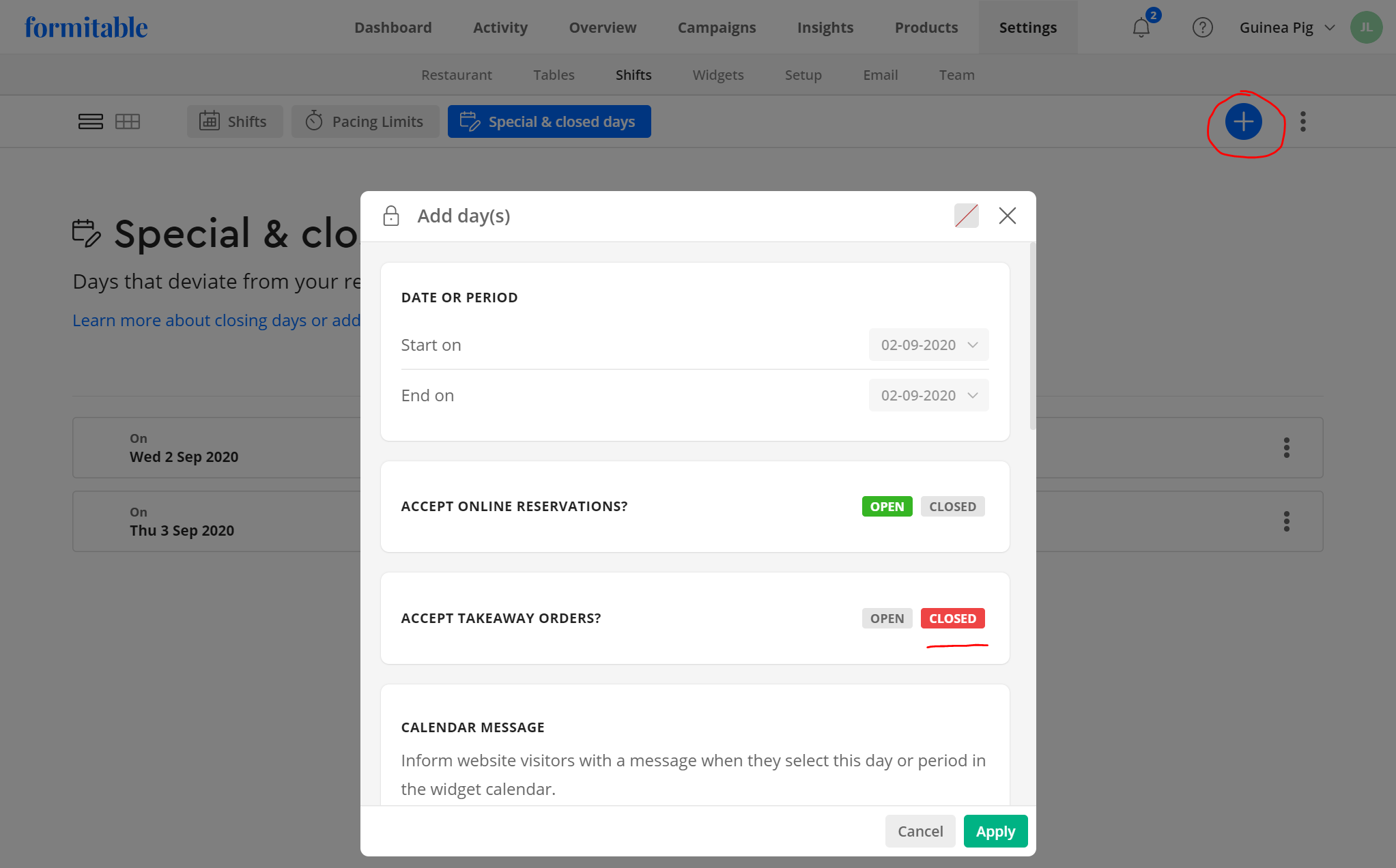 Als je op een bepaalde dag of aantal dagen geen takeaway bestellingen kunt of wilt accepteren, kun je dit in Formitable gemakkelijk instellen. Leer hieronder hoe je óf voor een individuele dag óf voor een reeks dagen takeaway stop kunt zetten.