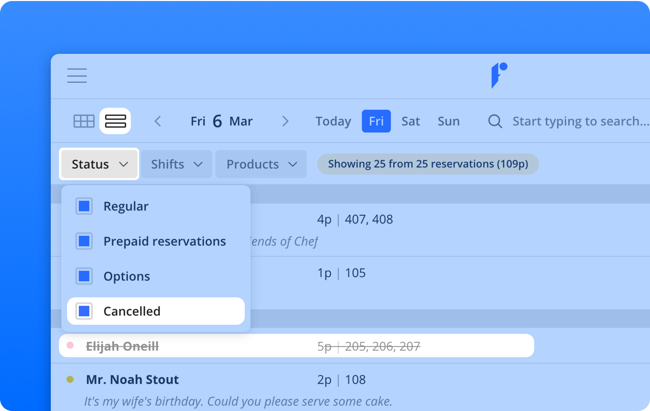 Formitable probeert je reserveringsoverzicht helder te houden. Door geannuleerde reserveringen automatisch te verbergen, kun je focussen op het belangrijke. Al je reserveringen - zelfs de geannuleerde - kun je echter wel terugvinden in de list view.