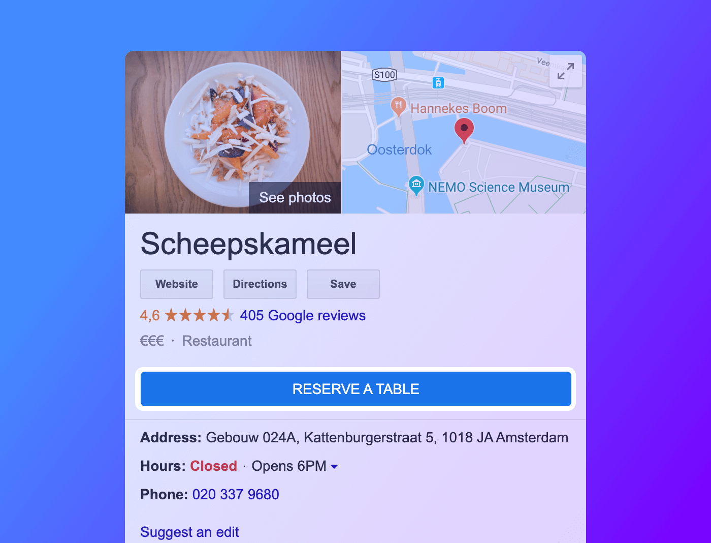 Reserveren met Google voegt reserveringsknoppen toe aan de zoekresultaten voor je restaurant in Google en Google Maps. Het reserveringsproces in Google is snel, intuïtief en makkelijk voor je gasten. Het helpt je meer tafels te vullen, zonder extra commissies of marketing.